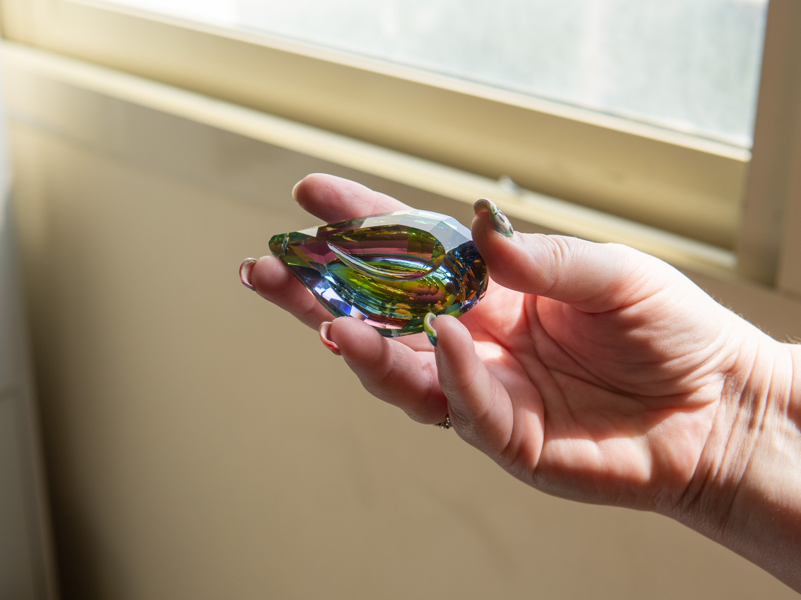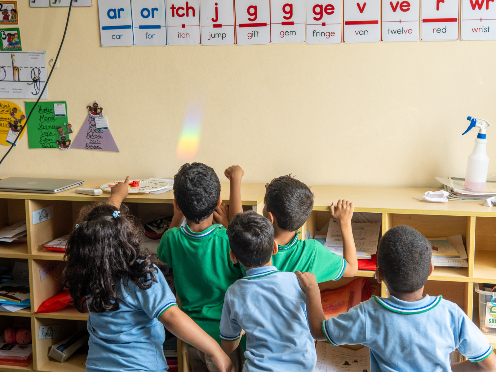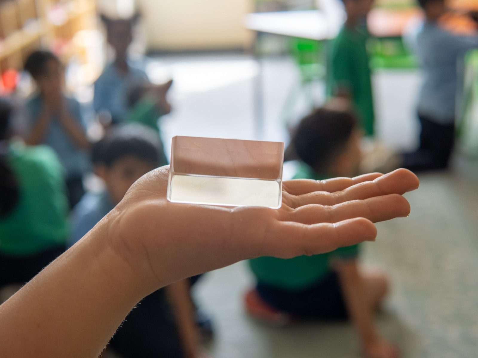 She showed how sunlight bends when it passes through a glass prism and crystals, revealing a rainbow. 🌈 Rainbows are made up of 7 colors that are always in the same order. The students have been learning the difference between 'colorful' and rainbow colors.