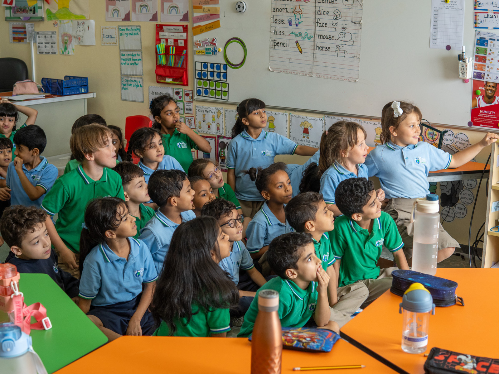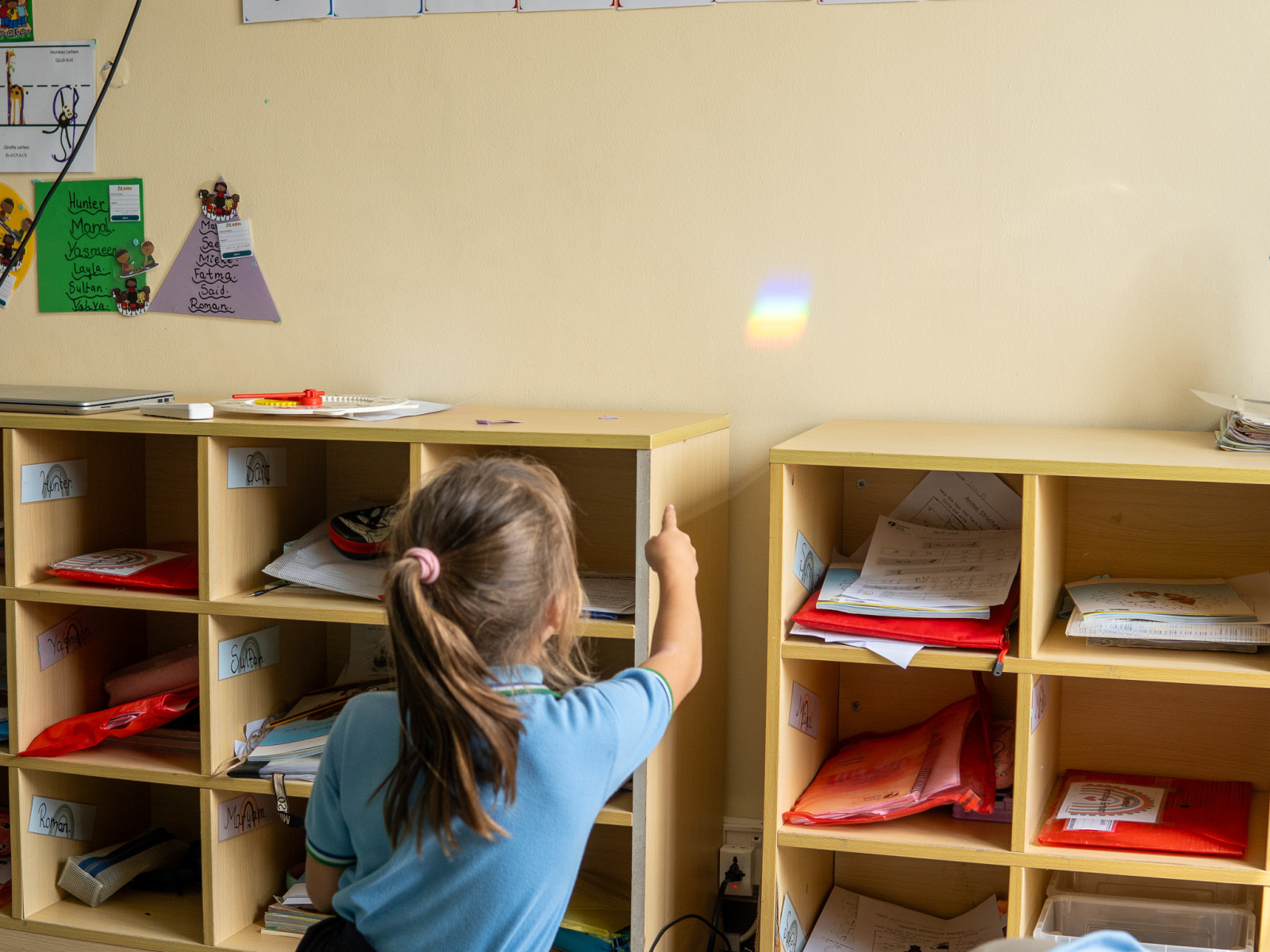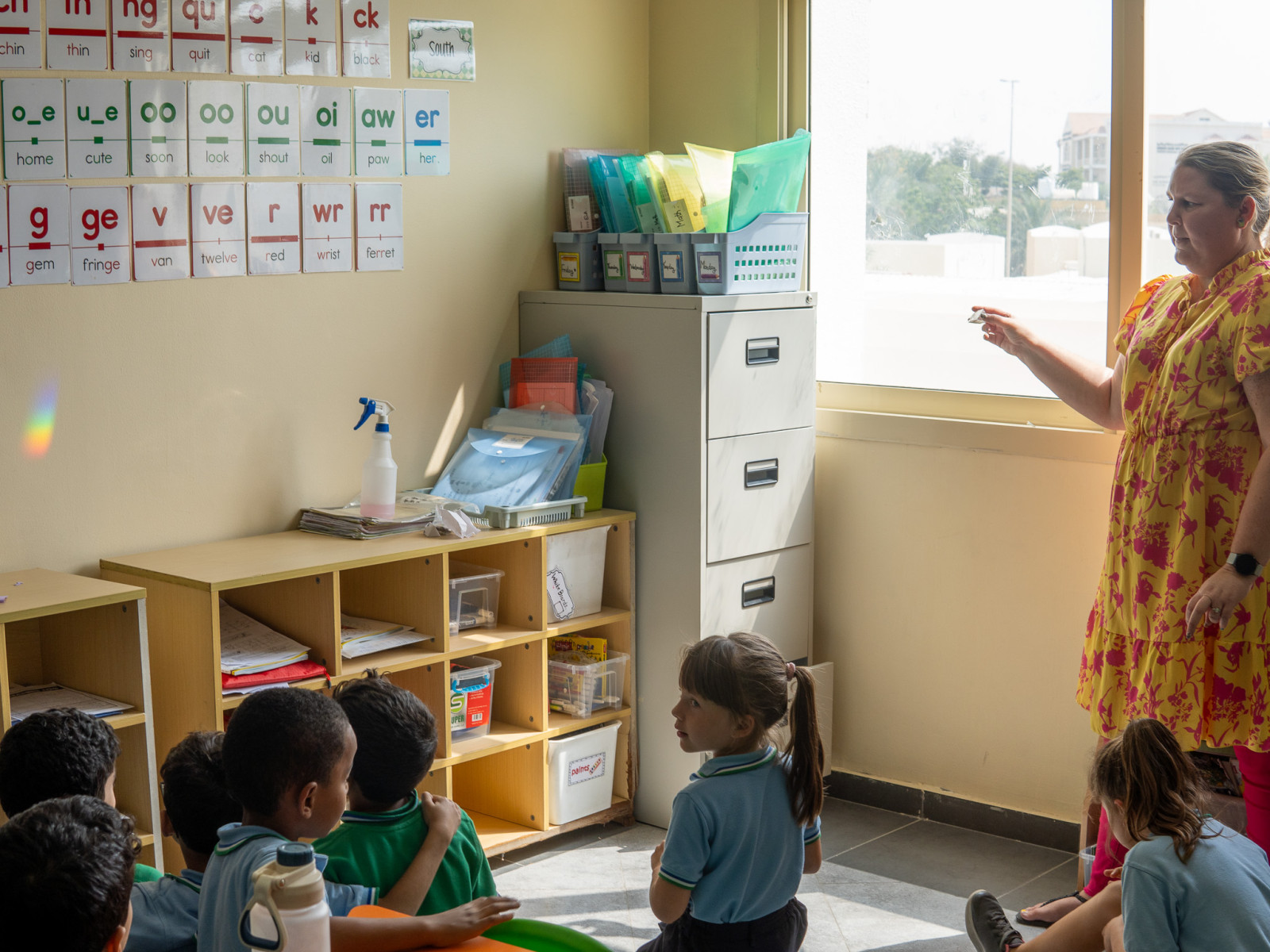 She showed how sunlight bends when it passes through a glass prism and crystals, revealing a rainbow. 🌈 Rainbows are made up of 7 colors that are always in the same order. The students have been learning the difference between 'colorful' and rainbow colors.