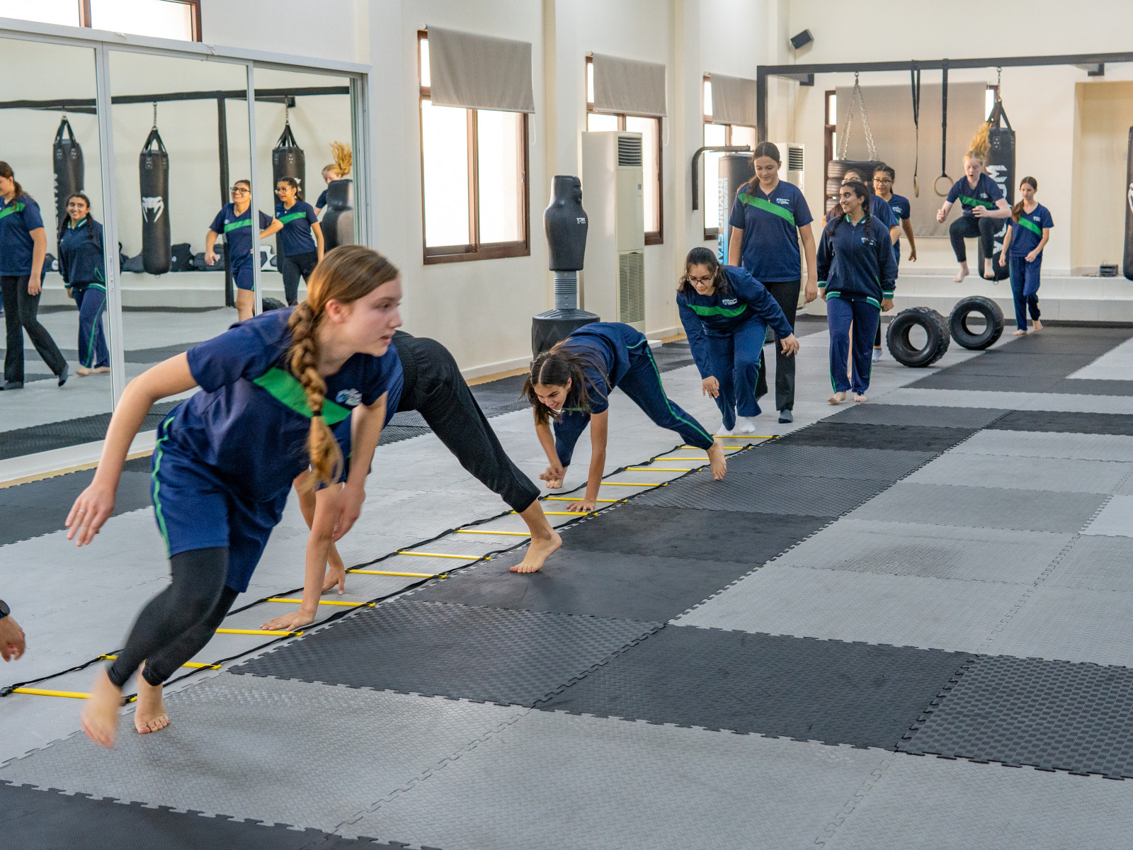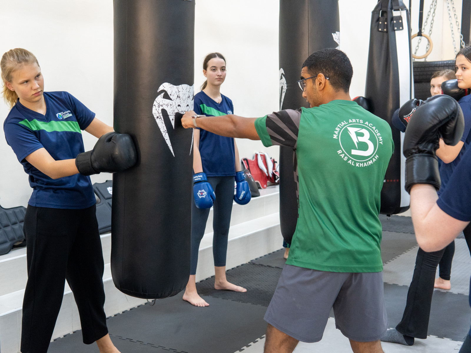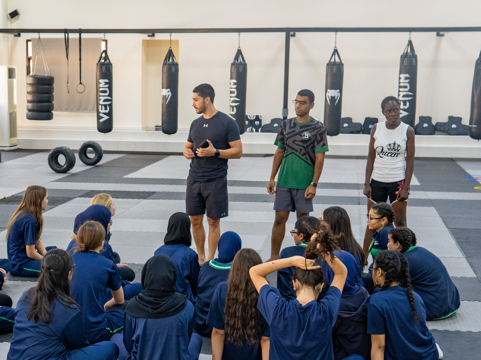 Our grade 9 and 10 girls attended a self-defense class at @base.rak. After a vigorous warm up, they were introduced to some real-life scenarios and effective countermeasures.